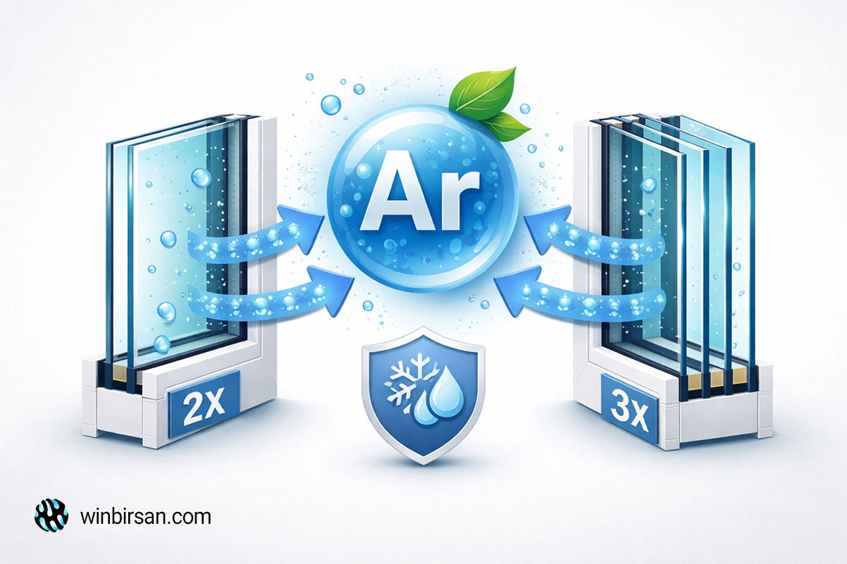 گاز آرگون (یا کریپتون در موارد نادر) رسانایی حرارتی بسیار کمتری نسبت به هوا دارد و فضای بین شیشه ها را عایق می کند. در دوجداره، آرگون ۲۰–۲۵٪ عایق بندی را بهبود می بخشد؛ در سه جداره این اثر دوچندان می شود چون دو فضای گازی وجود دارد. بدون گاز آرگون، حتی سه جداره هم کارایی واقعی اش را از دست می دهد.